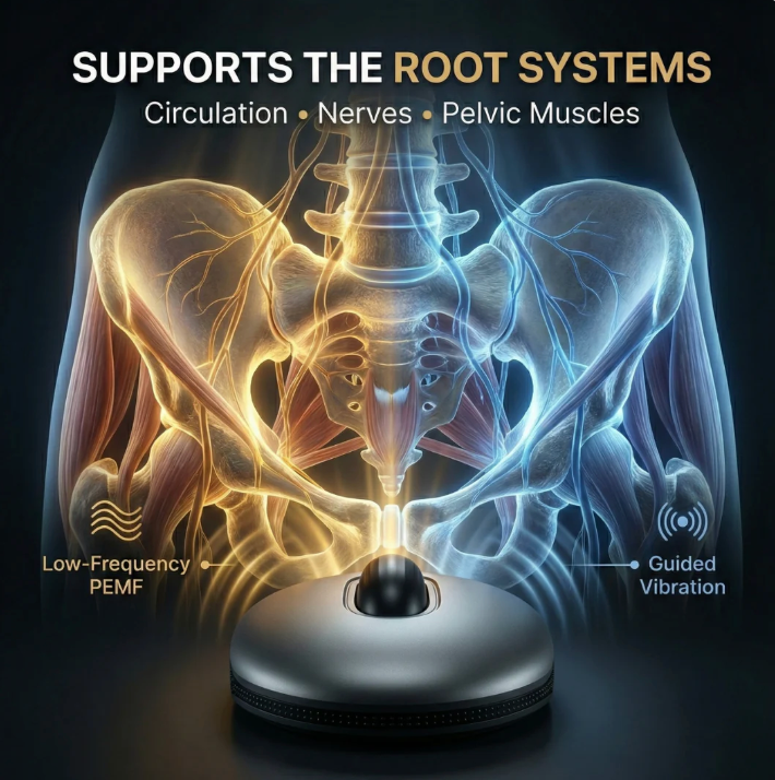 By targeting the perineal pelvic hub, it promotes healthier blood flow, improved nerve response, and muscle relaxation, helping support firmer, more reliable erections, better control, stamina, and overall pelvic and prostate health over time.