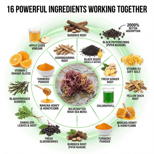 Taking Sea Moss alone helps. Adding Ashwagandha boosts it. But combining all 16 ingredients creates a synergistic effect that multiplies results.